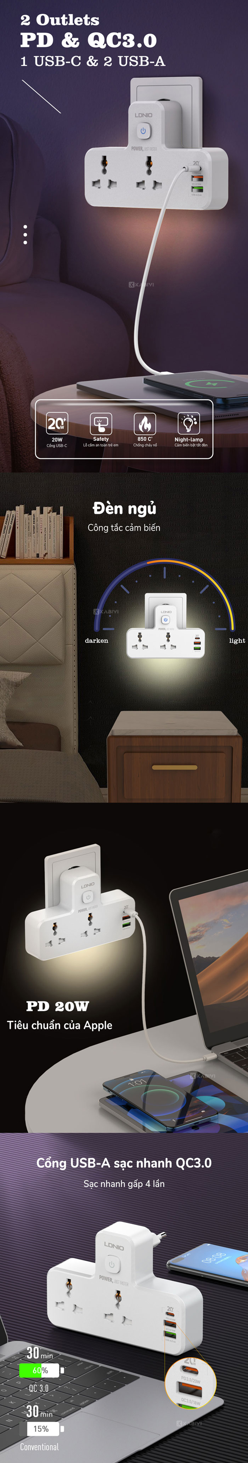 Cổng USB-C và USB-A sử dụng công nghệ PD3.0 sạc nhanh cho công suất sạc lên đến 20W
