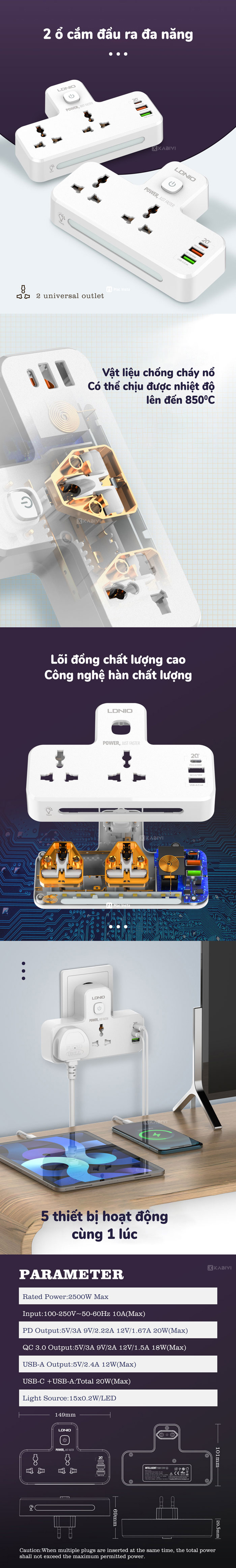 Tổng công suất lên đến 2500W phù hợp với mọi thiết bị điện tử gia đình và sạc điện thoại