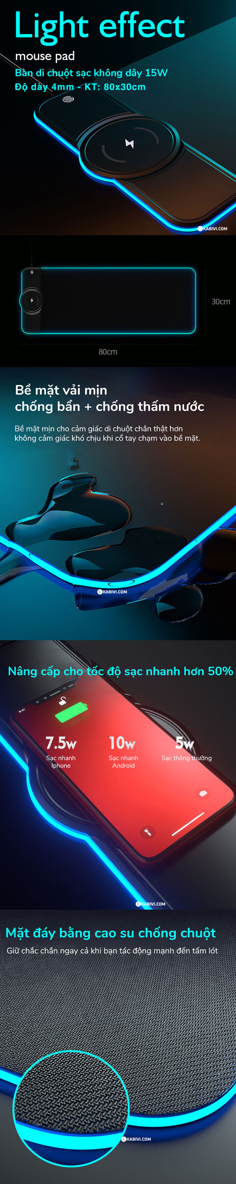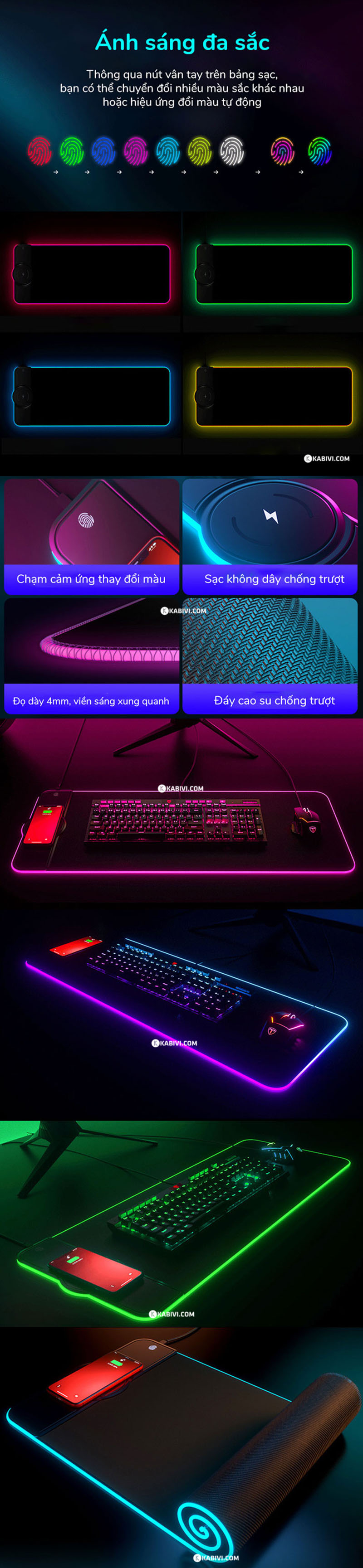 Tấm lót bàn làm việc, lót chuột tích hợp sạc nhanh không dây, tích hợp đèn viền trang trí đổi màu linh hoạt