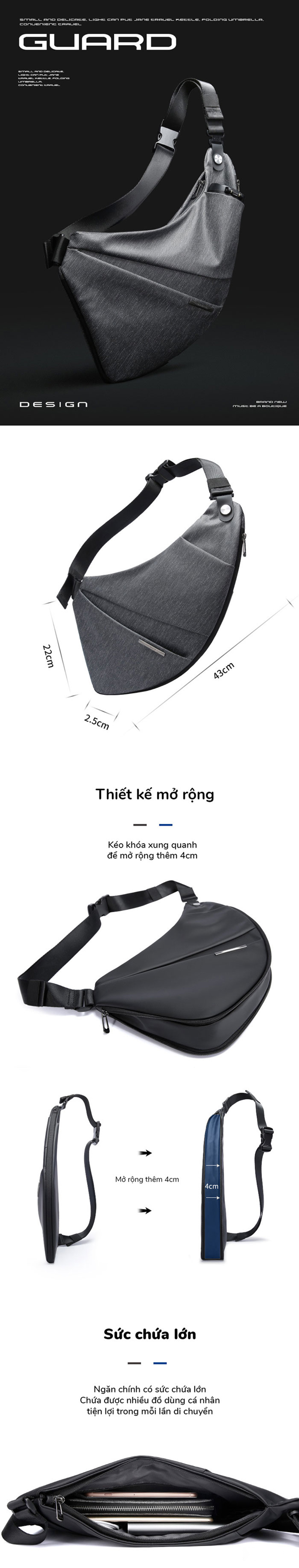 Thiết kế ôm sát người, gọn gàng khi đeo với kích thước và trọng lượng nhẹ. Kích thước: 43x22cm, trọng lượng: 0.41kg. Đựng vừa ipad 7.9inch